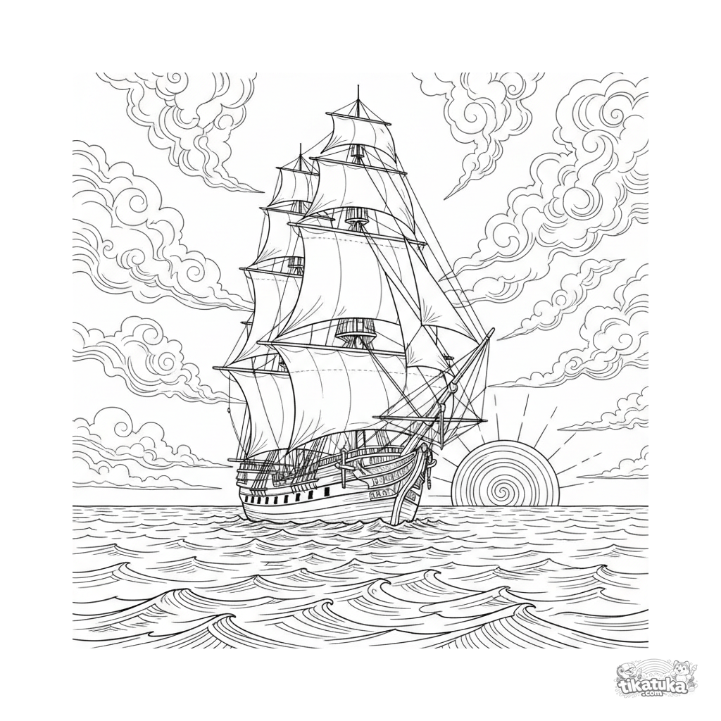 Página intrincada para colorir para 10-12 anos: um majestoso navio à vela navega contra um céu ao pôr do sol. Muitos detalhes no cordame e nas nuvens.