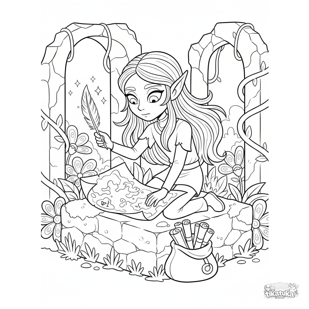Página para colorir para 7-9 anos: um elfo cartógrafo desenha um mapa em ruínas antigas cobertas de vegetação. Cena de fantasia com exploração e detalhes mágicos.