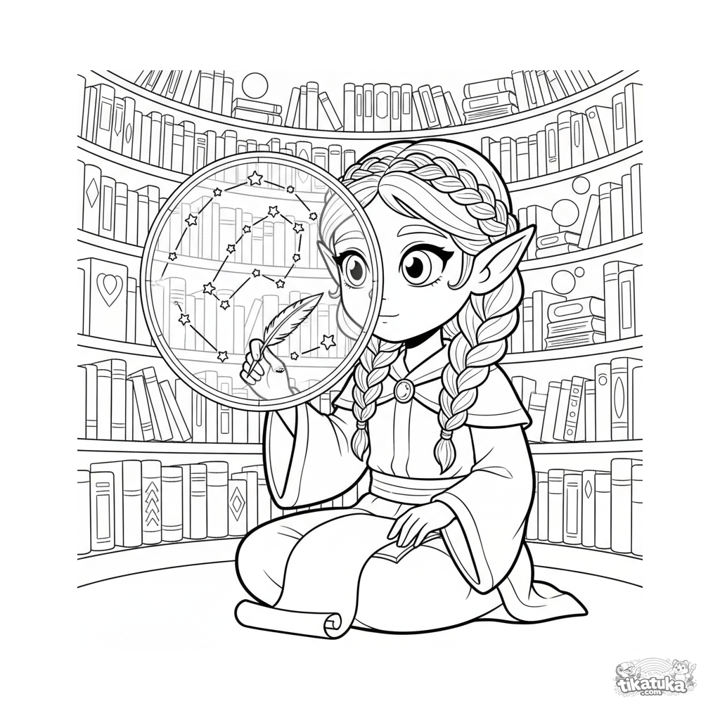 Página para colorir para crianças 7-9: um erudito elfo em uma biblioteca mágica estuda um mapa flutuante de constelações. Detalhe moderado.