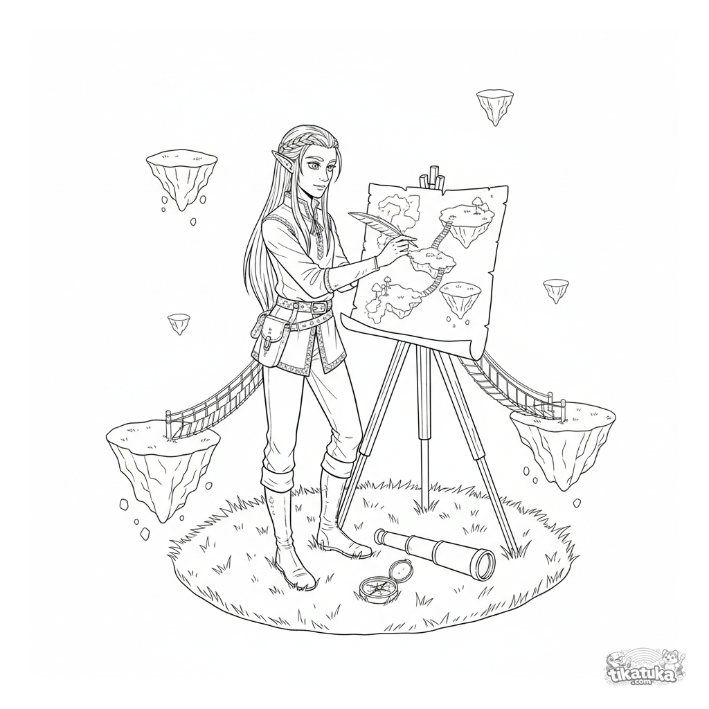 Página para colorir para 10-12 anos: um cartógrafo elfo mapeia meticulosamente uma cadeia de ilhas flutuantes. Cena detalhada no estilo fantasia de guia de campo.