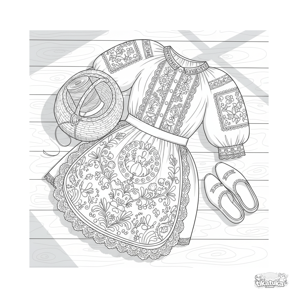 Página para colorir para 10-12 anos: um avental folclórico bordado e uma blusa dispostos no piso de madeira de um quarto. Padrões intrincados, cesta, carretel de linha e tamancos.
