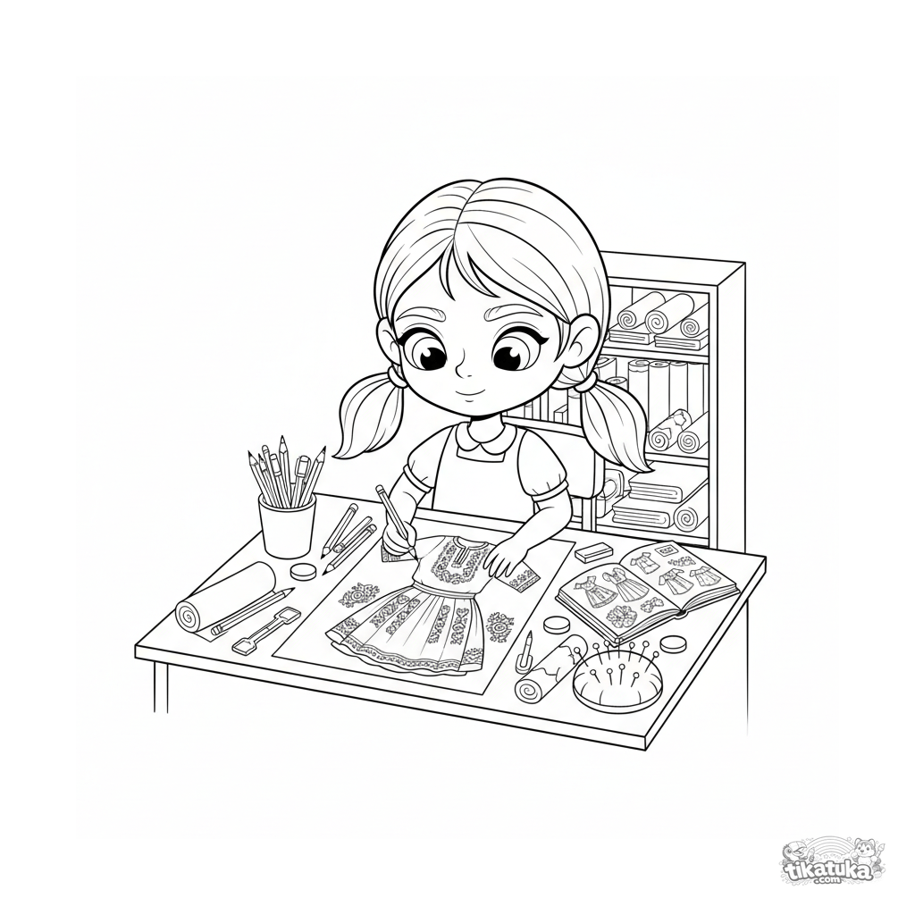 Página para colorir criativa para 10-12 anos: menina desenhando esboço de traje folk em sua escrivaninha. Estilo doodle caderno, muitos detalhes do processo criativo.