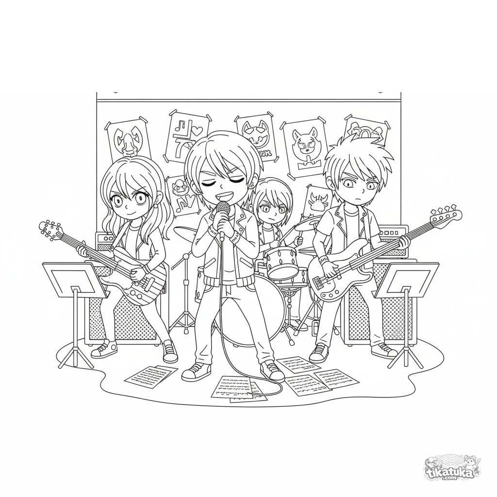 Página para colorir para crianças de 7 a 12 anos: uma banda emo-lite ensaia em um clube de música aconchegante. Muitos detalhes: instrumentos, pôsteres, partituras. Cena para colorir com paciência.