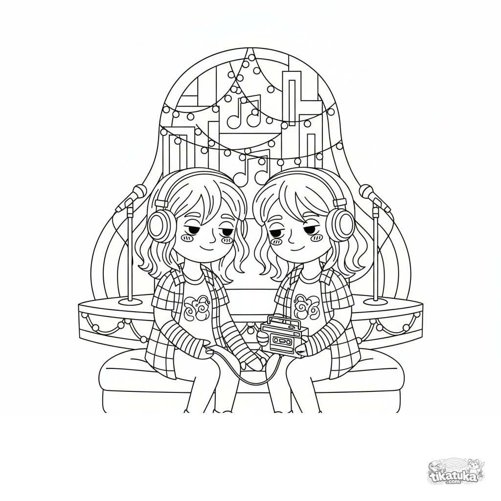 Página para colorir para crianças de 7-12 anos: dois amigos com estilo emo-lite relaxando em um clube de música aconchegante. Cena detalhada com palco, luzinhas e tocador de música.