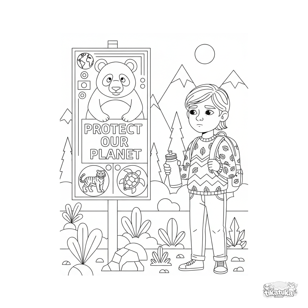 Página para colorir para crianças de 10-12 anos: uma placa informativa sobre espécies animais ameaçadas no zoológico. Cena sobre conservação.