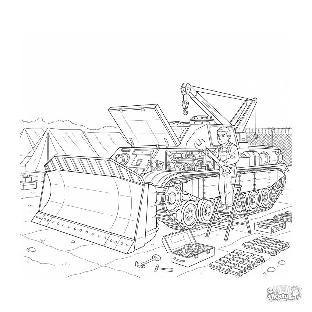 Página para colorir complexa para 10-12 anos: um tanque de engenharia detalhado com lâmina e guindaste em reparo no QG de campo.