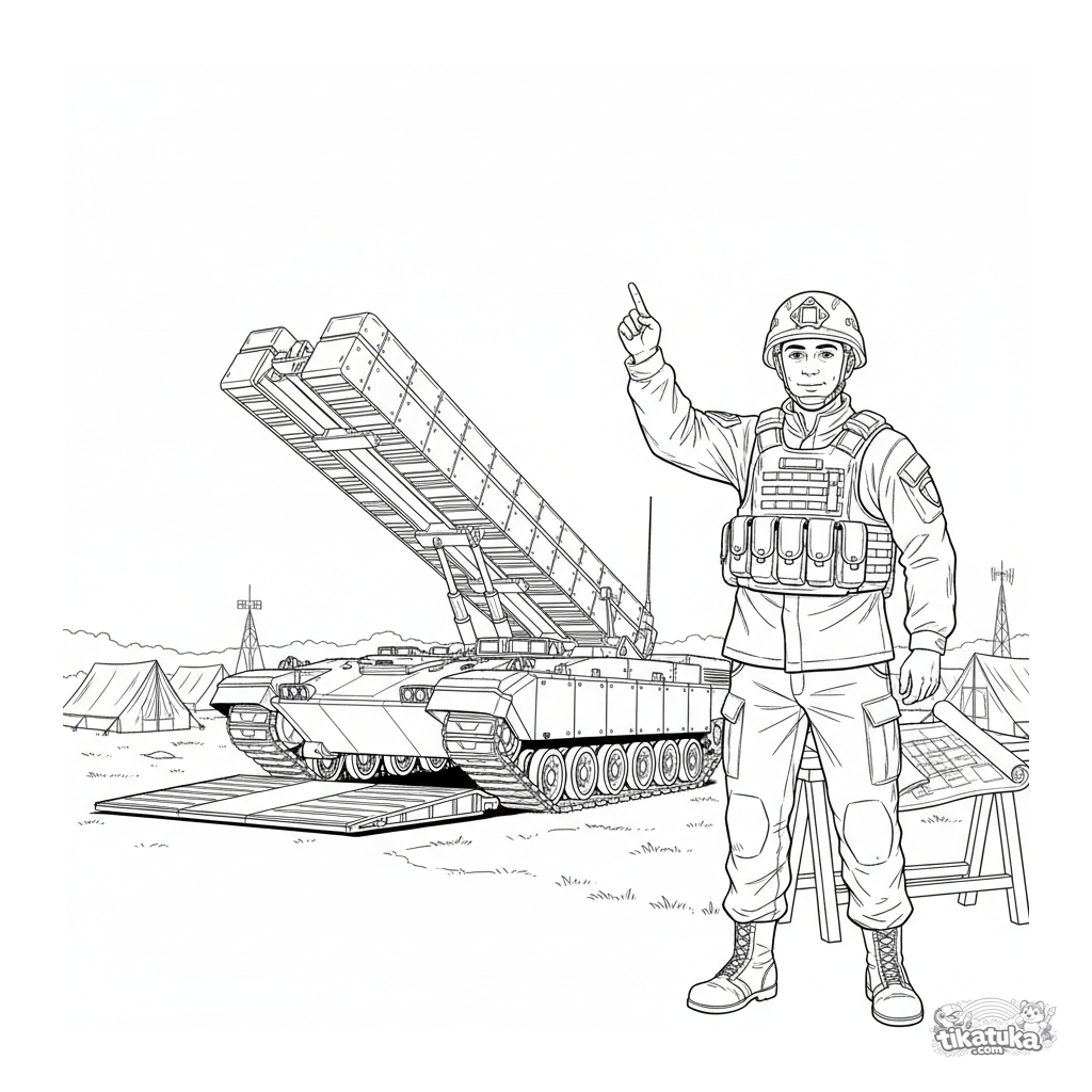 Página para colorir complexa para 10-12 anos: um engenheiro demonstrando um poderoso tanque lança-ponte na borda do quartel-general de campo.