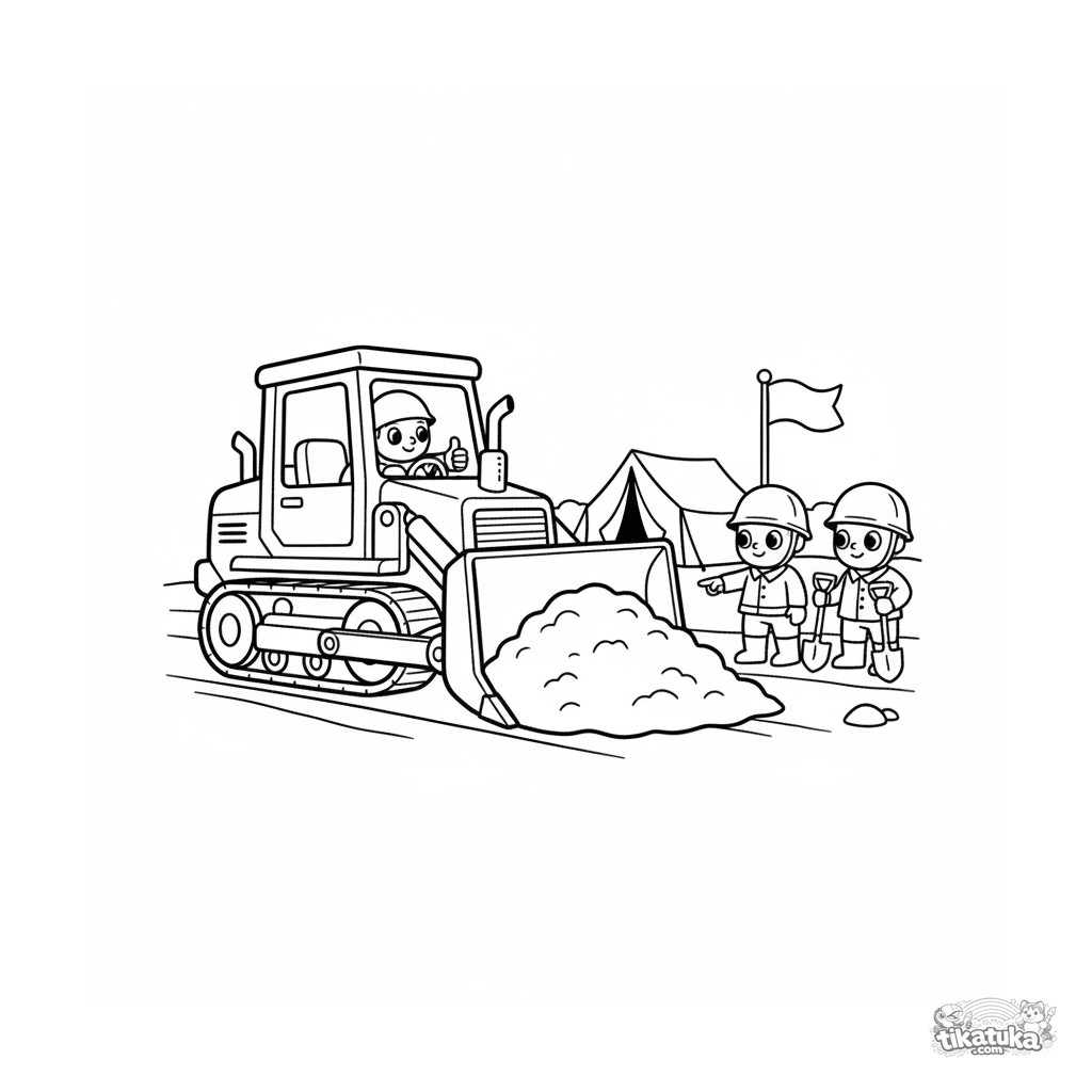 Página para colorir de um bulldozer de engenharia preparando terreno para barracas. Para crianças de 4 a 6 anos.
