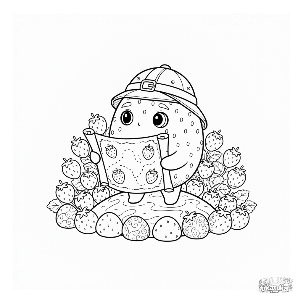Página para colorir realista para crianças de 10 a 12 anos: um mochi explorador com mapa em um campo de mochis de morango. Contornos detalhados, atmosfera de aventura.