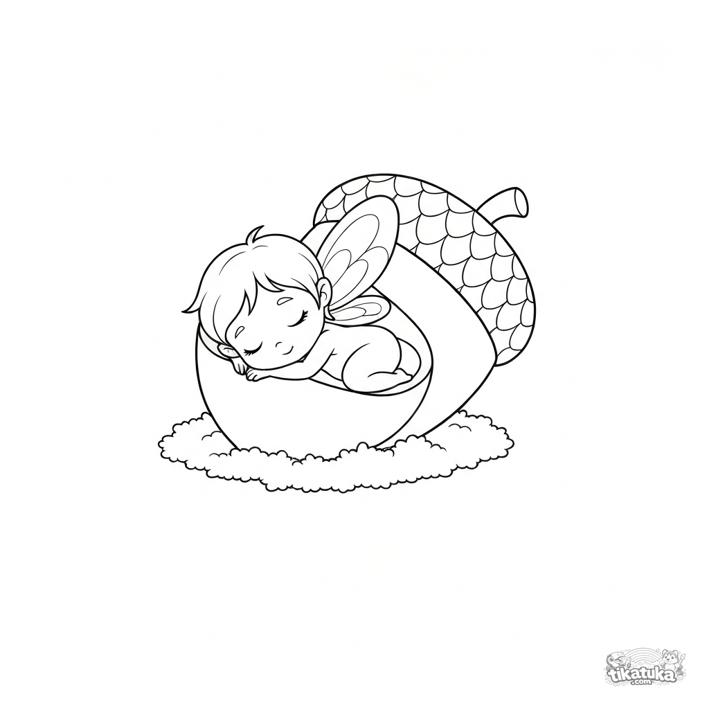 Página para colorir de uma fada minúscula adormecida em um berço aconchegante feito de uma bolota oca. Imagem muito simples e fofa para crianças a partir de 2 anos.