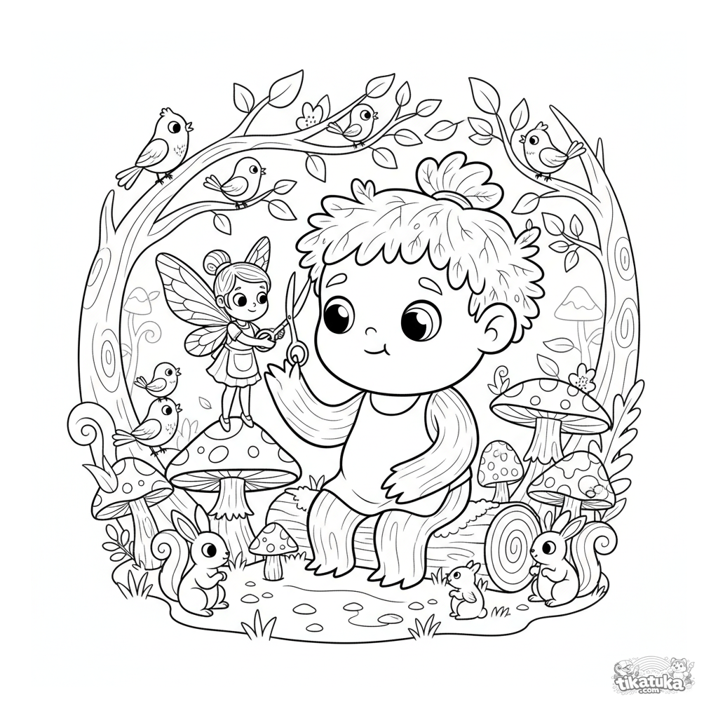 Página para colorir para crianças 4-6: uma fofa fada cabeleireira dá um corte de folhas em um treant grande e gentil na floresta encantada. Cena sobre amizade e cuidado.