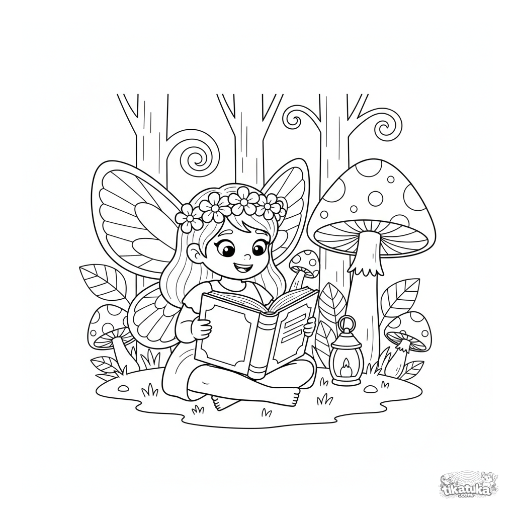 Página para colorir para crianças 5-7: uma fada fofa lê um livro enorme sob um cogumelo brilhante em uma floresta encantada.