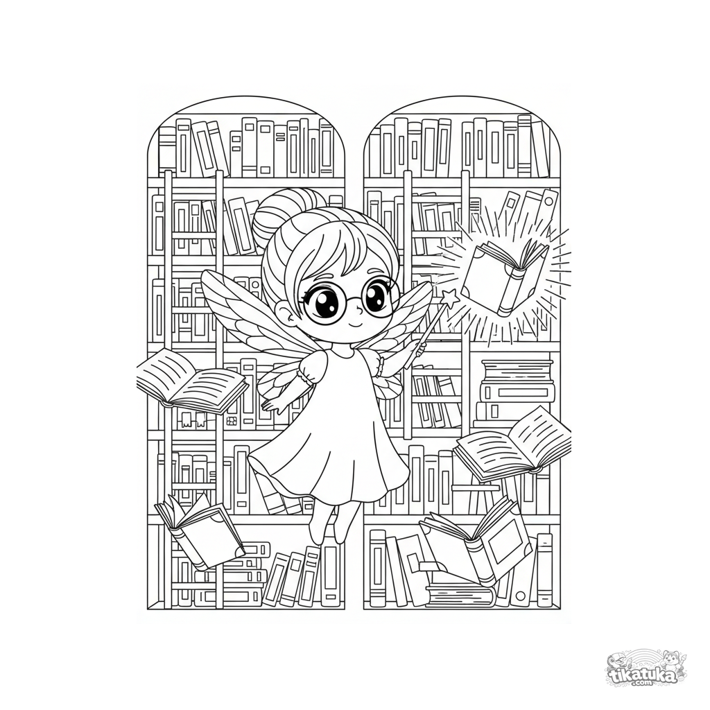 Página para colorir para pré-adolescentes 7-9: uma fada bibliotecária com óculos organizando livros brilhantes e pairantes em uma vasta biblioteca mágica. Cena de fantasia com detalhes.