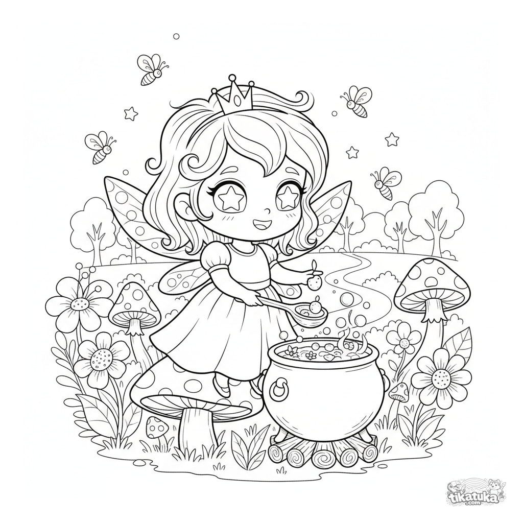 Página para colorir para crianças de 4 a 6 anos: uma pequena princesa fada com asas mexe uma poção de pétalas em um caldeirão em um jardim encantado.