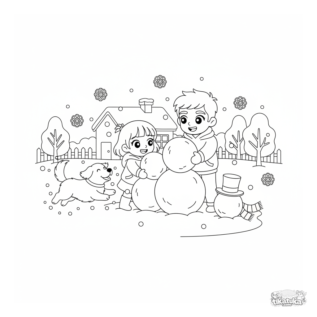 Página para colorir para crianças de 4-6 anos: uma cena de inverno alegre onde uma criança e um pai constroem um boneco de neve em um quintal nevado, flocos de neve caem e um cachorro pula por perto.