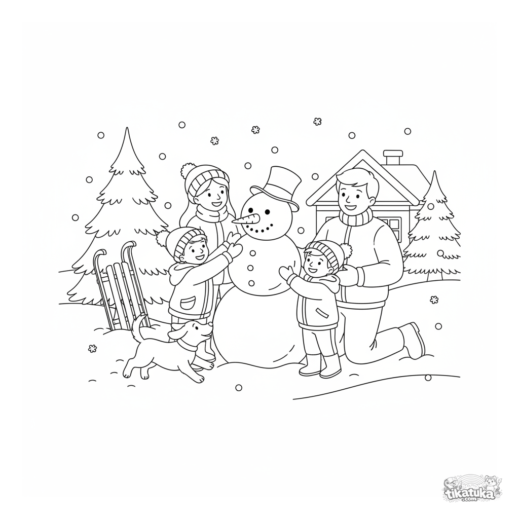 Página de inverno para colorir para crianças de 4-6 anos: uma família feliz constrói um boneco de neve em um dia ensolarado. Estilo realista, muitos detalhes para colorir.