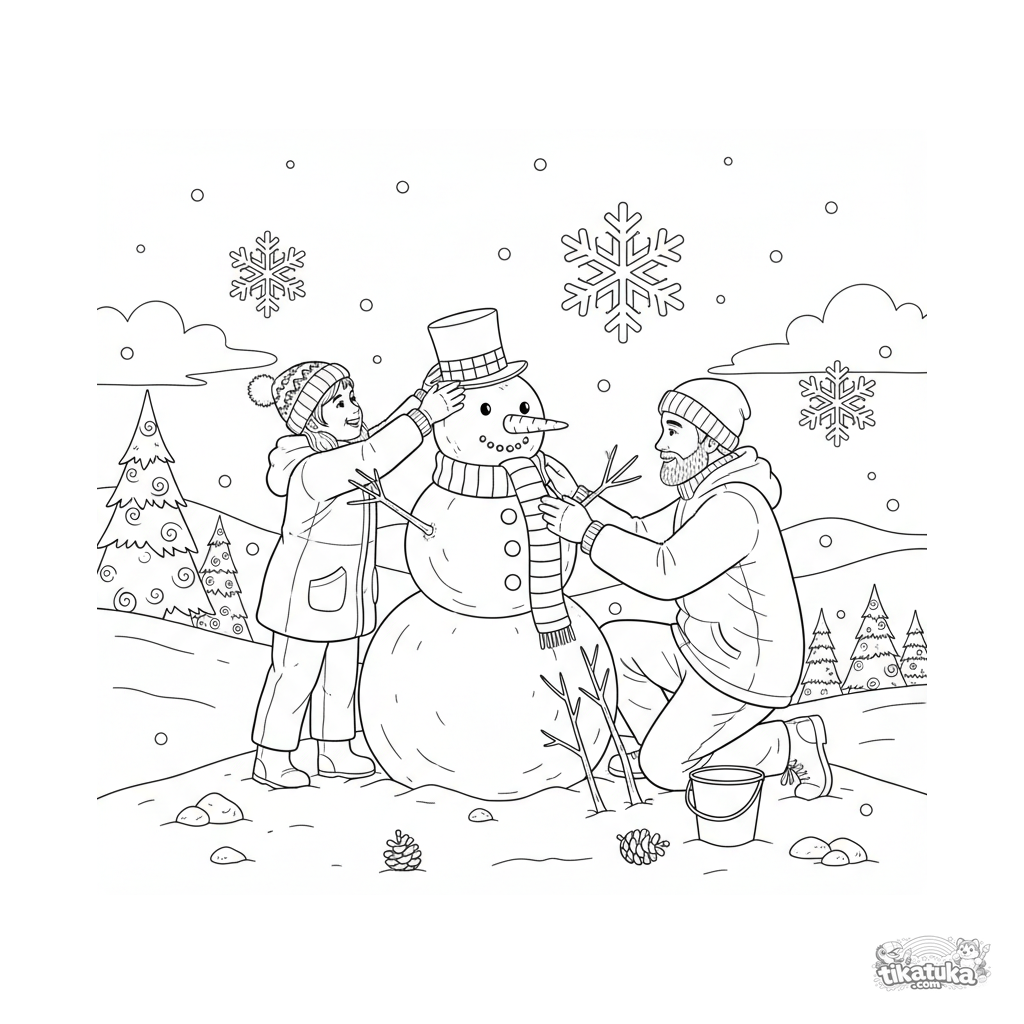 Página para colorir difícil para crianças de 7-12 anos: uma cena detalhada de uma família construindo um boneco de neve em uma colina nevada com flocos de neve caindo.