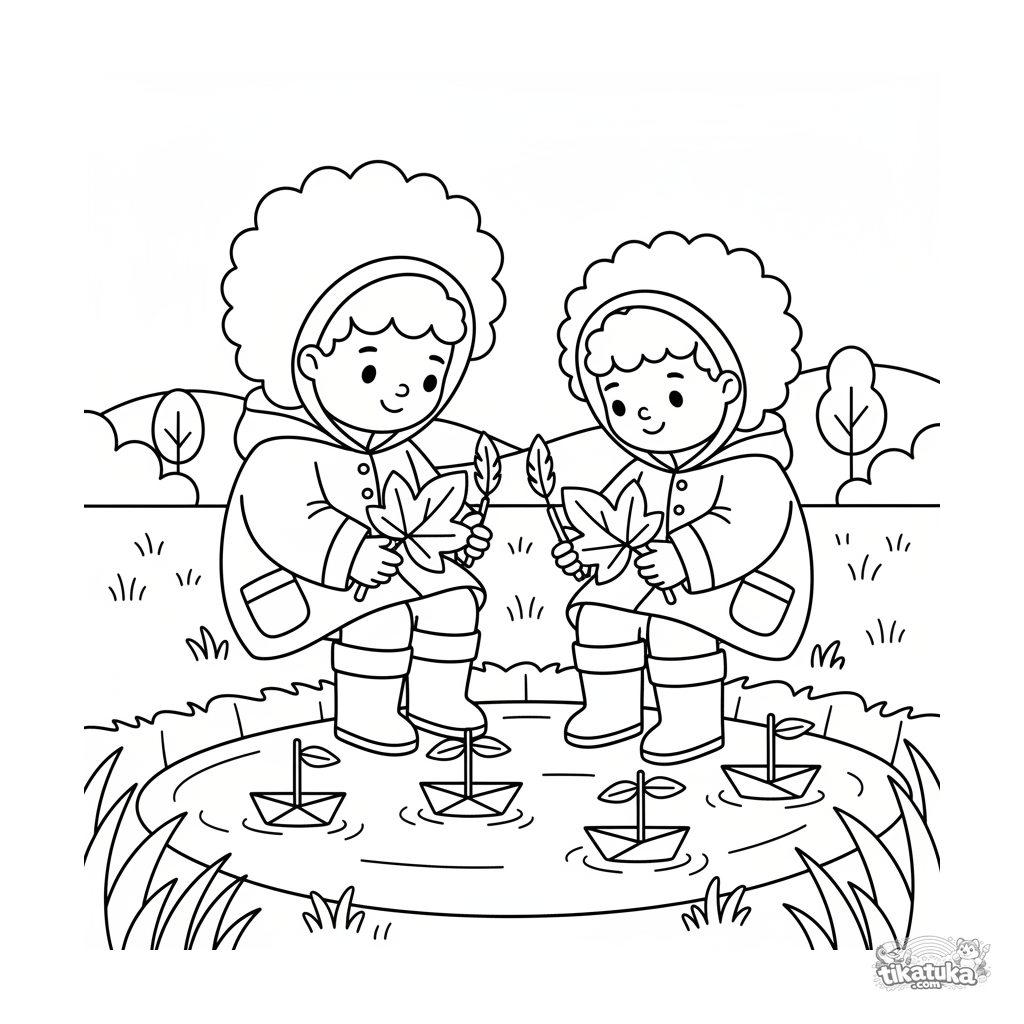 Página para colorir para crianças de 4-6 anos: um pai e um filho com roupas de chuva constroem barcos de folhas em uma vala com água. Estilo folclórico, detalhe moderado.