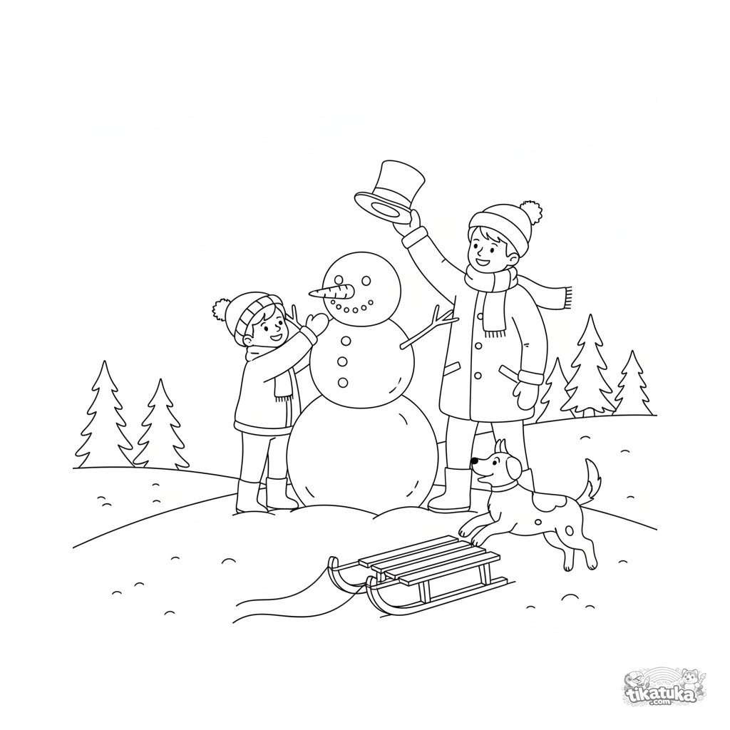 Página para colorir para crianças 4-6: uma cena de inverno de uma família feliz construindo um boneco de neve juntos em uma colina nevada, com um cachorro e um trenó.