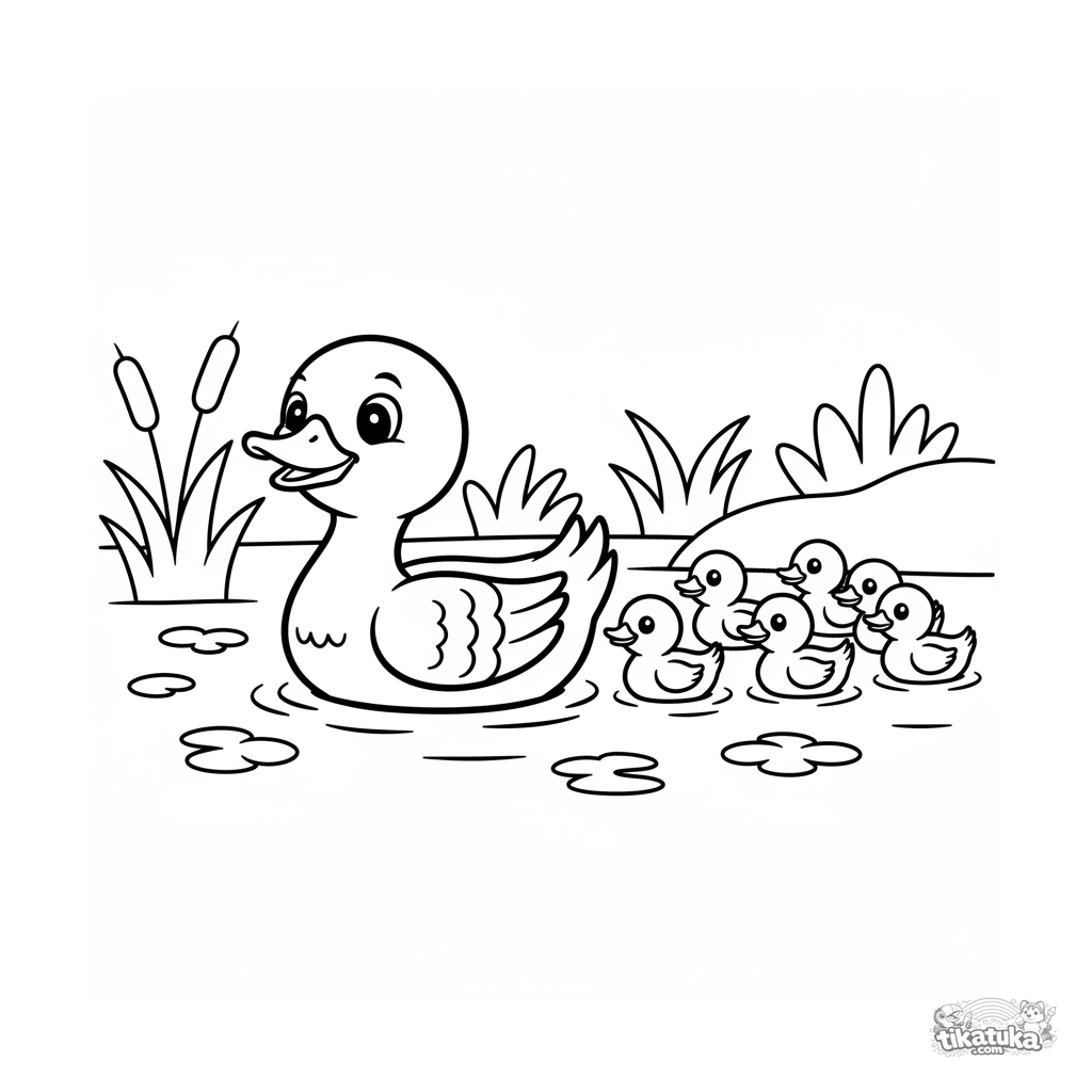 Página para colorir simples para crianças pequenas 2-3: uma pata mãe e patinhos fofinhos nadando em fila por um riacho calmo e claro.