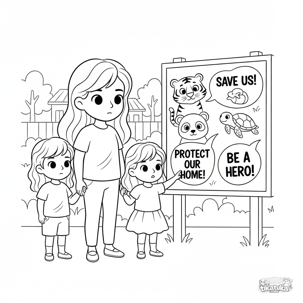 Página para colorir para crianças de 4-6 anos: uma família aprende com um quadro informativo sobre espécies animais ameaçadas no zoológico.
