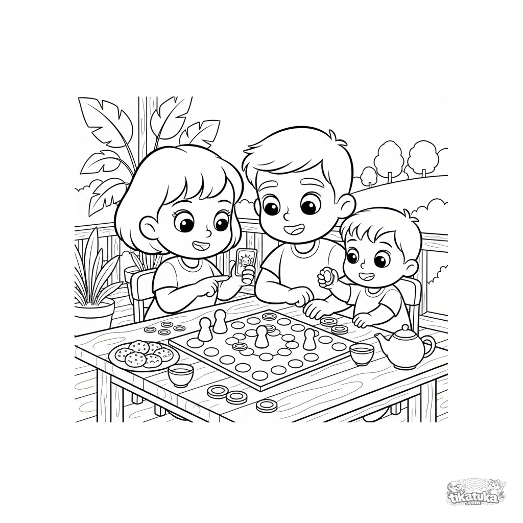 Página para colorir para crianças de 4-6 anos: uma família brincando alegremente de jogo de tabuleiro na mesa da varanda de verão. Cena vibrante com biscoitos e chá.