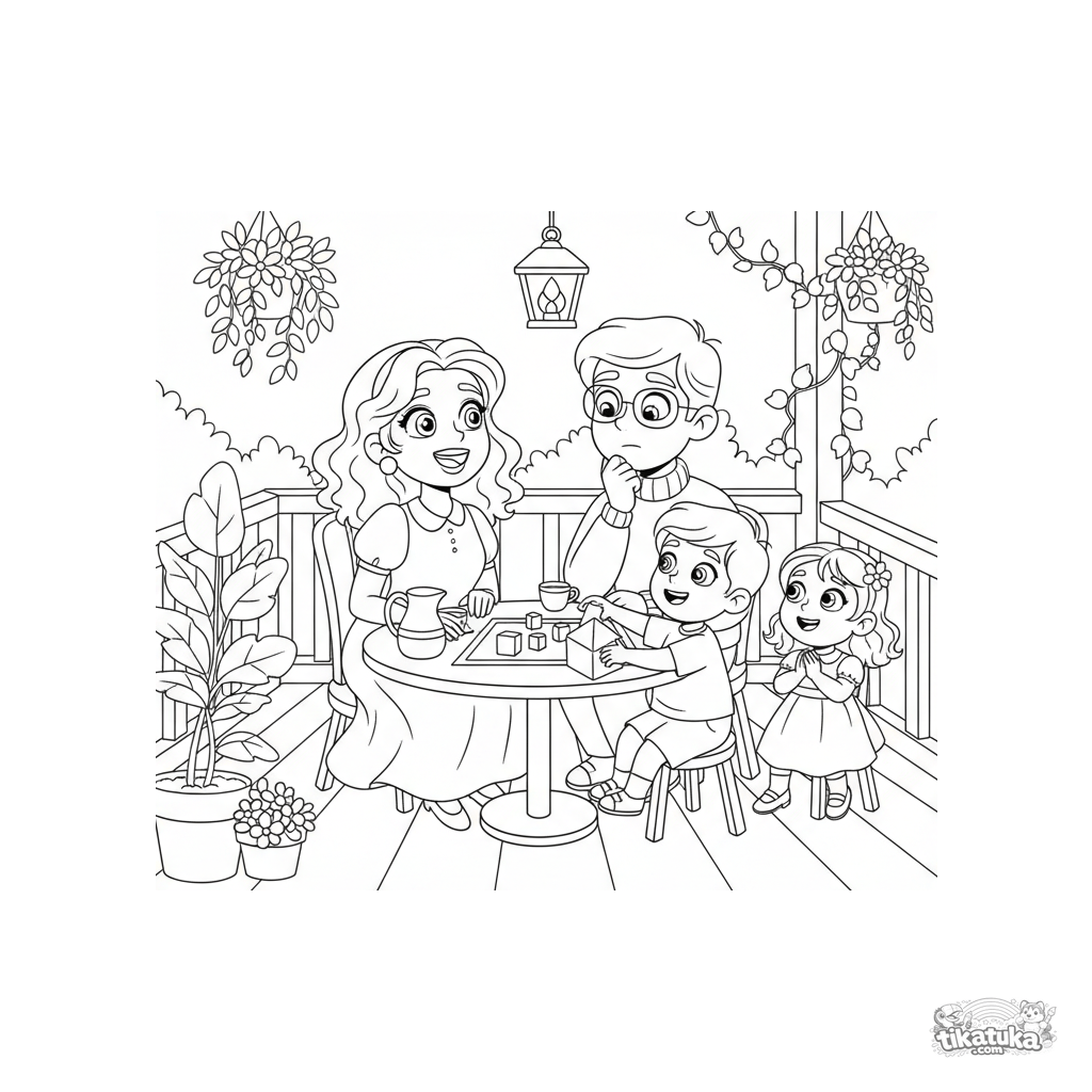 Página para colorir para 7-9 anos: uma família jogando um jogo de tabuleiro na mesa da varanda aconchegante ao anoitecer. Cena com emoções, peças do jogo e um bule de chá.
