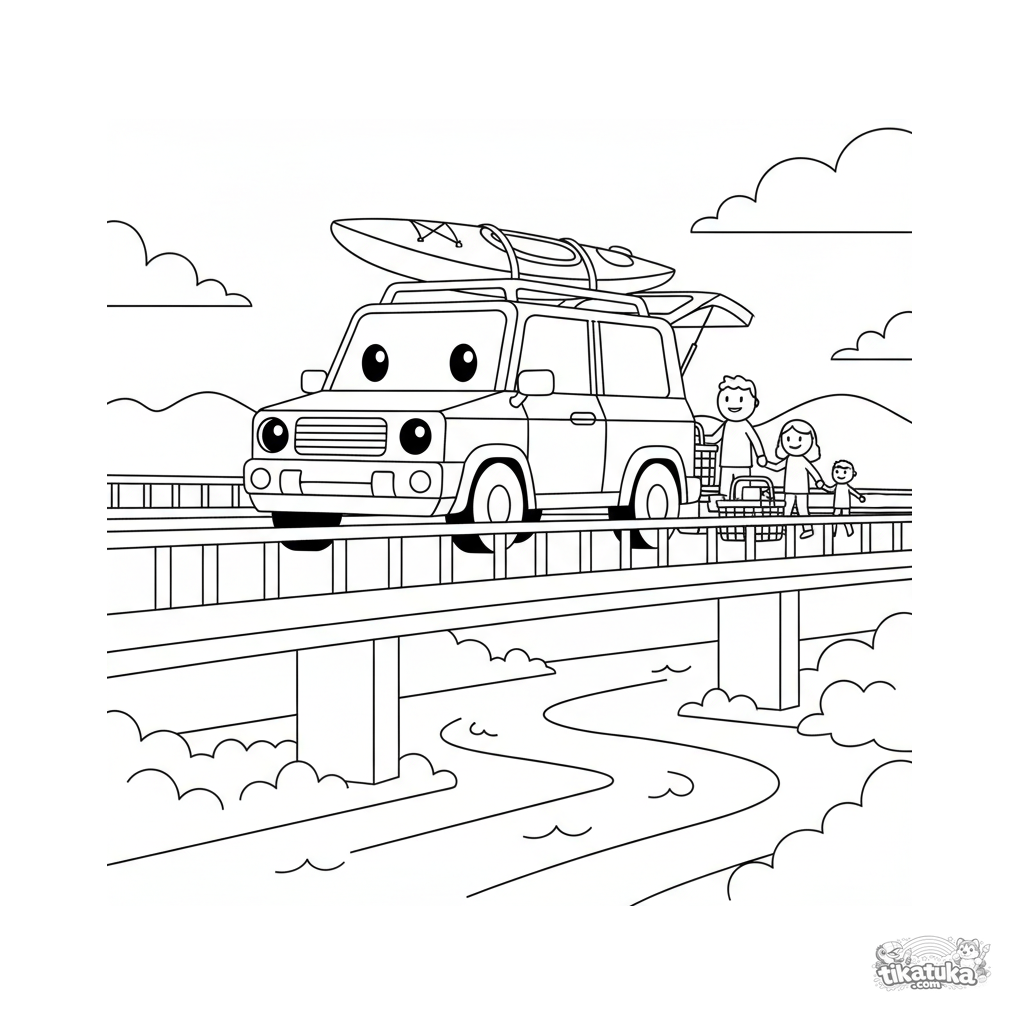 Página para colorir para crianças 4-6: um SUV familiar com um caiaque no teto parado em uma ponte sobre um rio, se preparando para um piquenique. Cena simples.