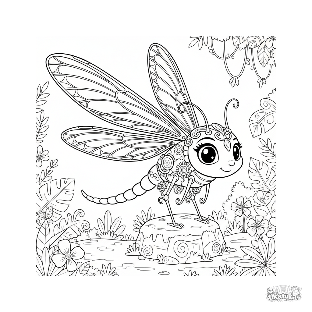 Página de fantasia detalhada para crianças mais velhas de 10-12 anos. Um ornitóptero de libélula intrincado repousa em uma pedra na clareira da selva.