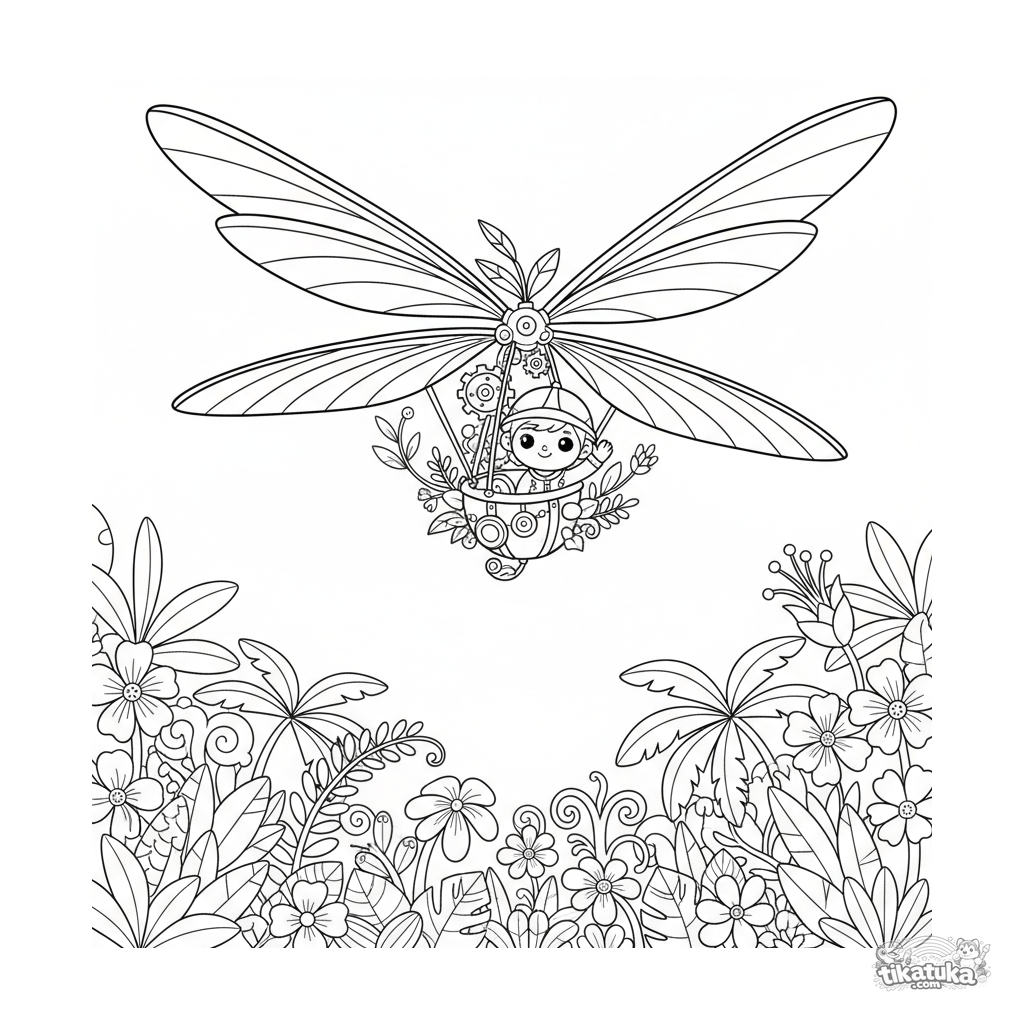 Página para colorir de um ornitóptero de fantasia com asas batendo, voando sobre a floresta. Ilustração de estilo fantasia para crianças de 7 a 9 anos.