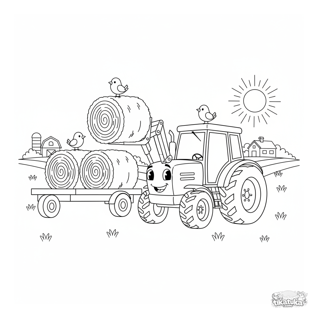 Página para colorir para crianças: um trator moderno carregando fardos redondos de feno num campo. Para meninos de 4-6 anos.