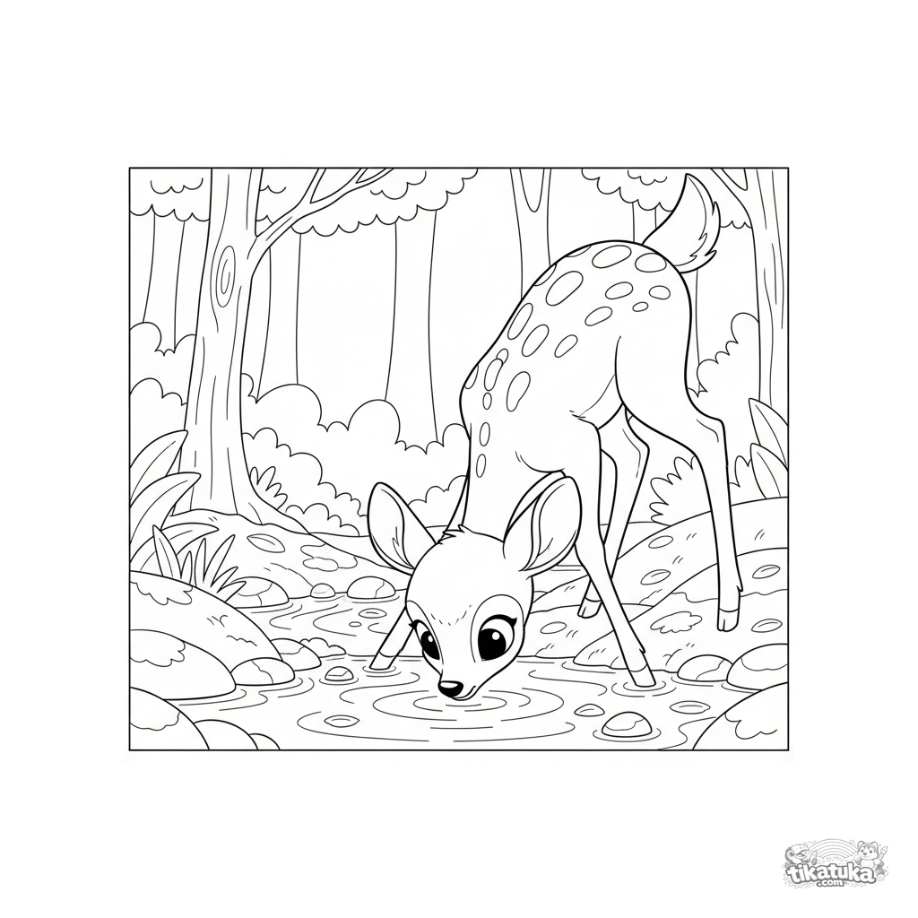Página para colorir para crianças 7-9: um filhote de veado malhado bebe água cautelosamente de um riacho da floresta. Cena comovente da natureza da primavera no estilo clássico de desenho animado.