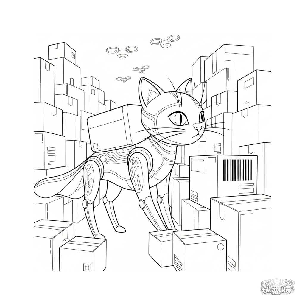 Página para colorir complexa para crianças mais velhas de 10-12 anos: um robô realista em forma de gato com antenas de bigode percorre um labirinto de caixas em um vasto armazém, escaneando um código de barras.