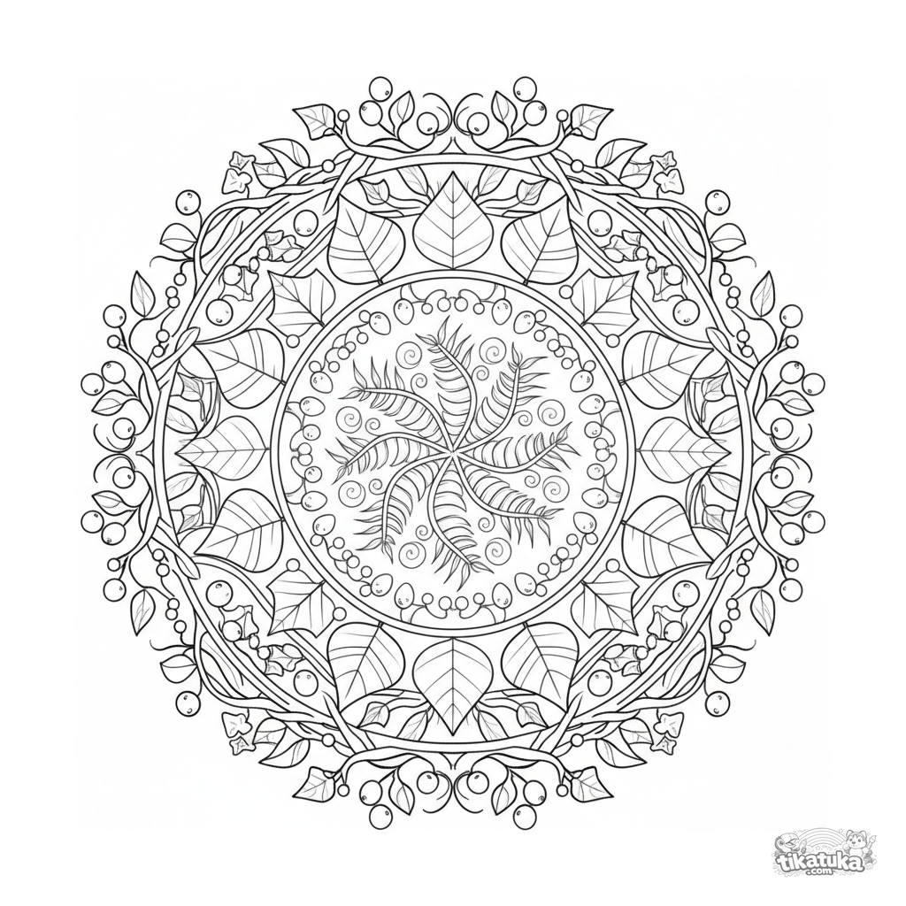 Página para colorir intrincada de mandala botânica para 10-12 anos. Composta por anéis concêntricos de samambaias, folhas de bordo, carvalho e videiras com bagas. Alto detalhe com veias, tema natureza.