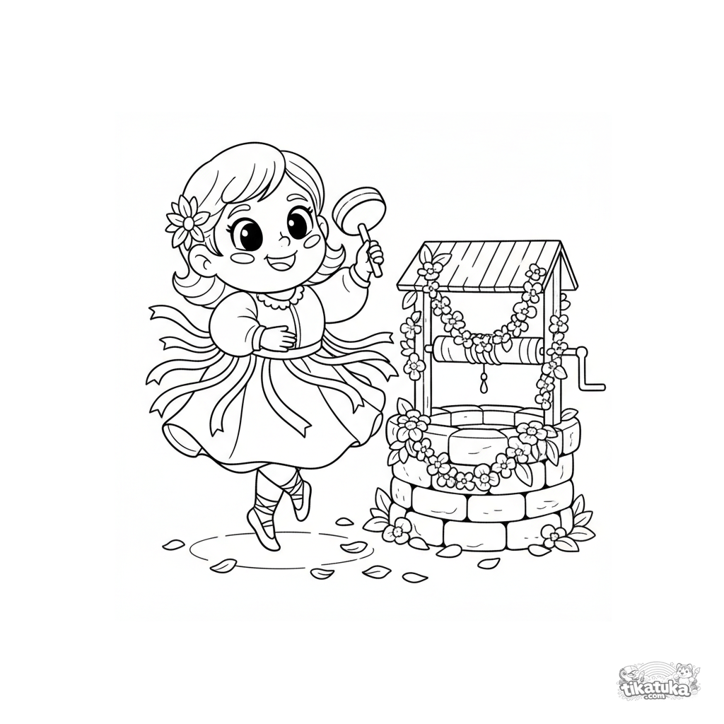 Página para colorir para pré-adolescentes 7-9: um dançarino de festival bebendo água do poço. Estilo de bordado folclórico, padrões brilhantes.