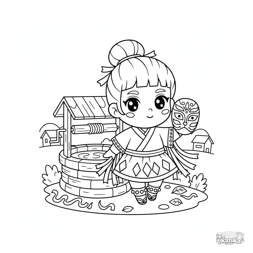Página para colorir para pré-adolescentes 7-9: um dançarino de festival em traje cerimonial descansando no poço de água viva. Silhuetas nítidas no estilo de recorte de papel.