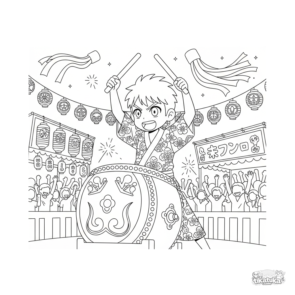Página para colorir anime vibrante: um baterista toca taiko em um matsuri de verão animado. Fundo com lanternas, serpentinas e uma multidão. Para crianças de 10-12 anos.