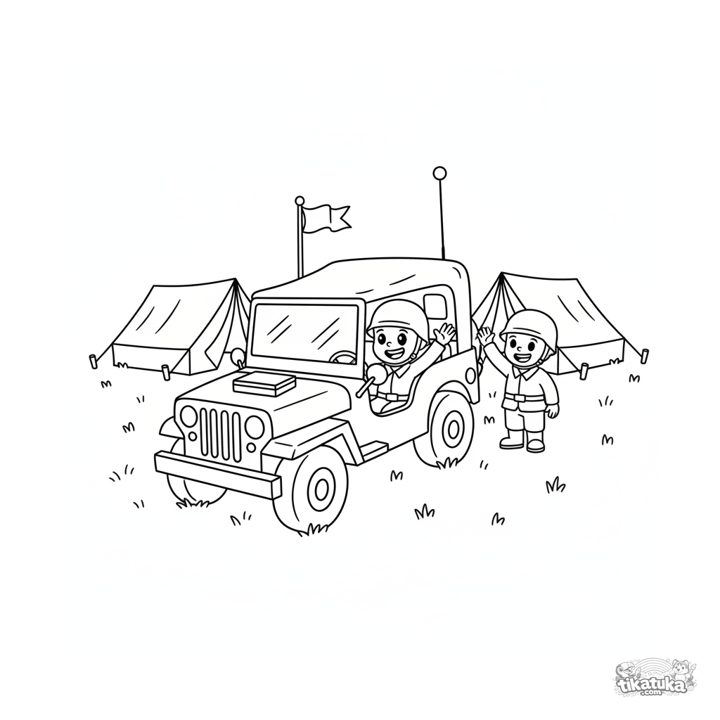 Página para colorir para crianças de 4-6 anos: um jipe de comando com rádio, estacionado perto do quartel-general de campo com barracas. Um motorista alegre está acenando.