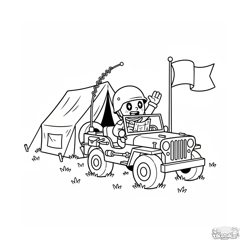 Página para colorir para crianças de 4-6 anos: um jipe militar de rádio estacionado perto de uma barraca de QG de campo. Um soldado alegre acena da janela.
