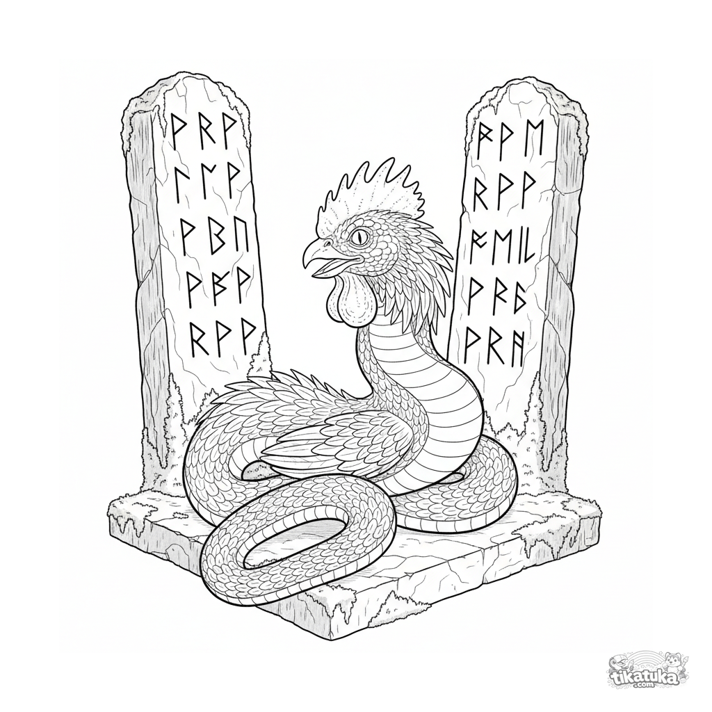 Página detalhada para colorir para 10-12 anos: um basilisco em estilo de guia de campo científico entre megálitos. Texturas realistas e detalhes precisos para coloristas experientes.