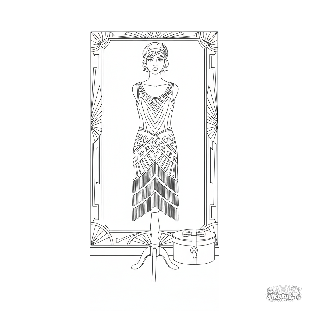 Página para colorir detalhada estilo guia de campo para meninas 10-12: um vestido flapper dos anos 20 em um manequim na vitrine de uma boutique art deco.