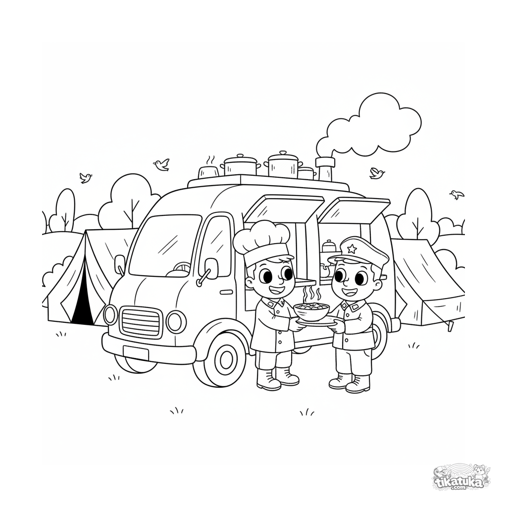 Página para colorir para 4-6 anos: uma cozinha de campo alegre sobre rodas serve comida para soldados perto das barracas. O cozinheiro e um soldado sorriem.