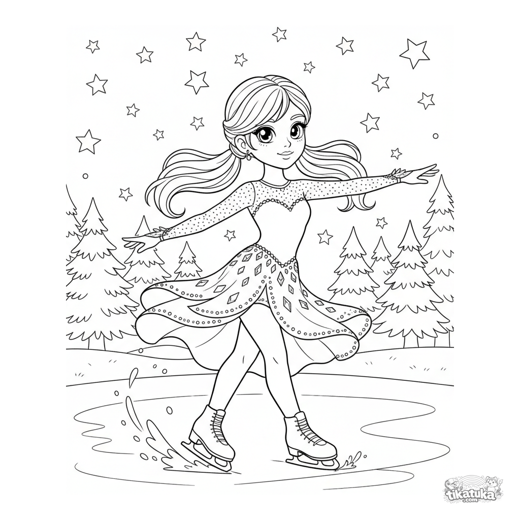 Página complexa para colorir para meninas 10-12: patinadora artística em vestido detalhado girando no gelo, com efeitos de spray e fundo de floresta de inverno.