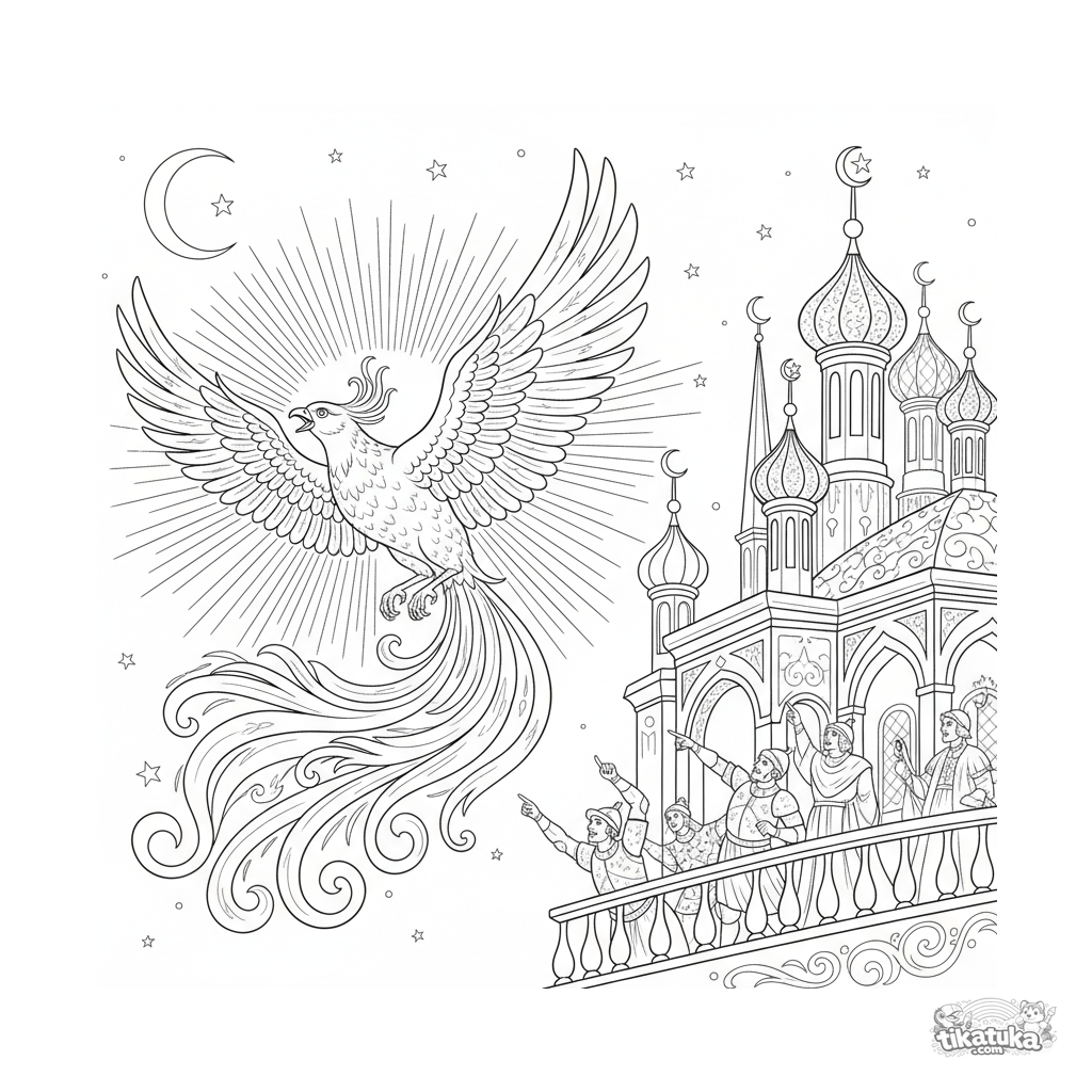 Página para colorir com o Pássaro de Fogo voando sobre o palácio do tsar no céu noturno. Para crianças mais velhas de 7-12 anos. Cena detalhada e mágica de um conto de fadas russo.