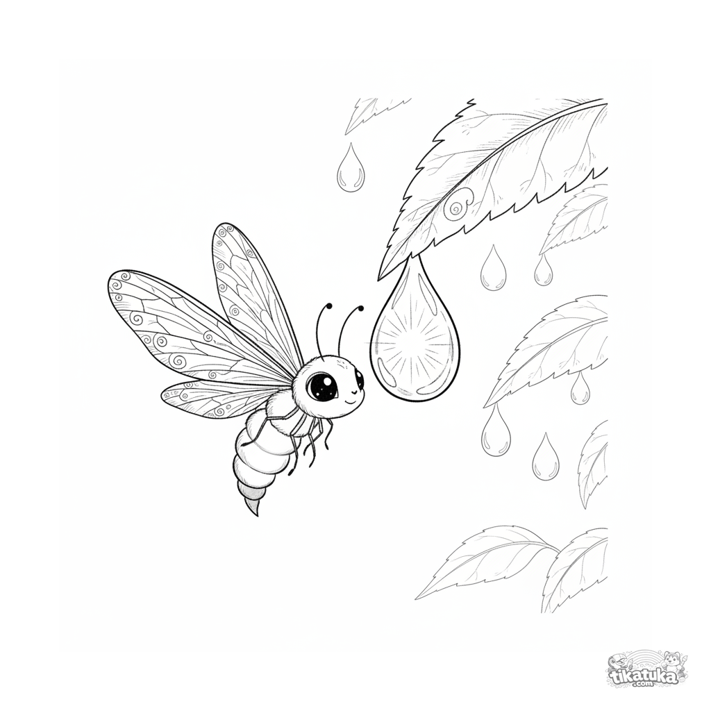 Página para colorir complexa para crianças mais velhas de 10-12 anos em estilo aquarela-esboço: o brilho de um vaga-lume ilumina uma gota de orvalho pendurada por dentro, criando uma cena noturna mágica em uma folha.