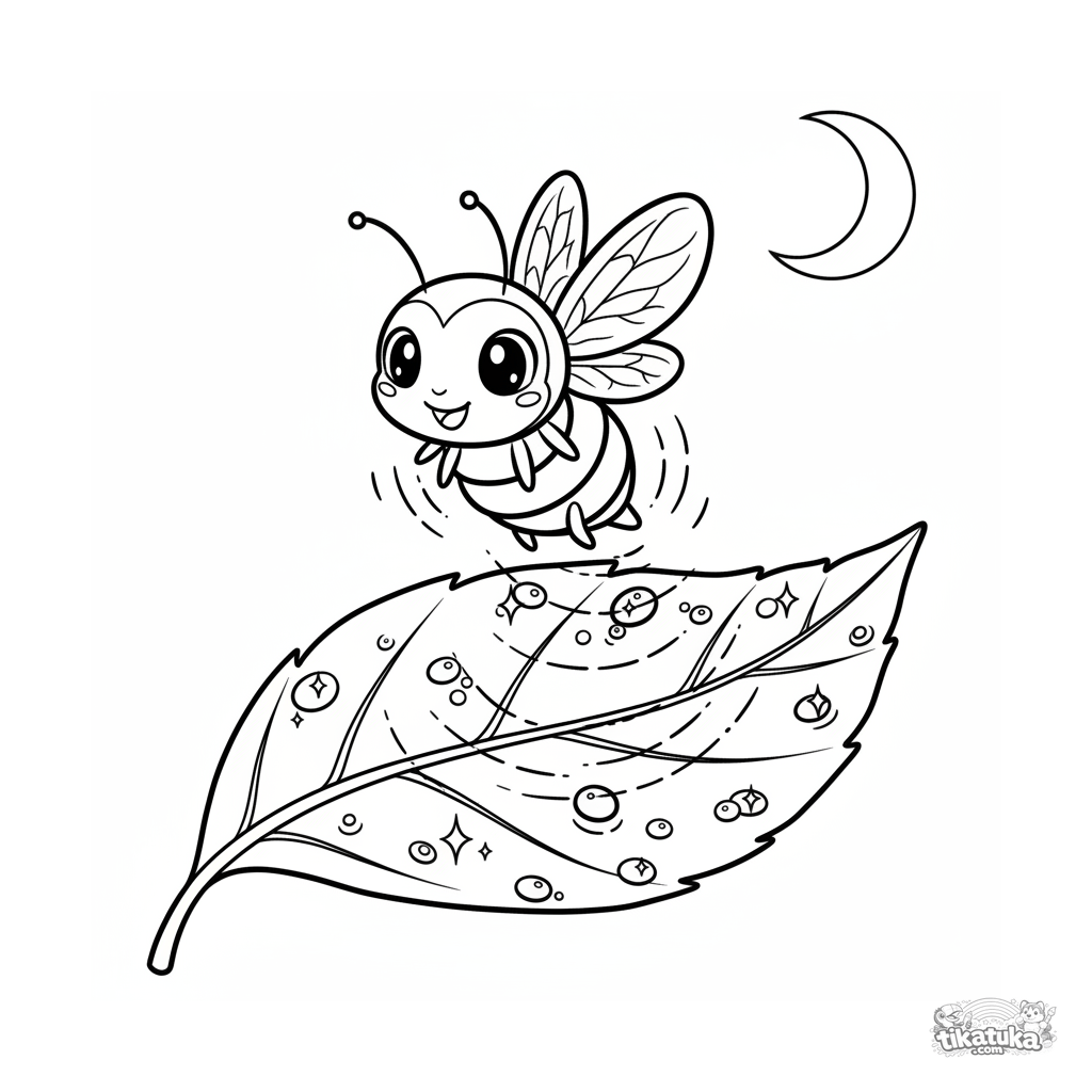 Página para colorir para crianças de 4-6 anos: um vaga-lume amigável ilumina uma folha com orvalho à noite. Estilo anime kodomo, olhos grandes expressivos, cena noturna mágica.