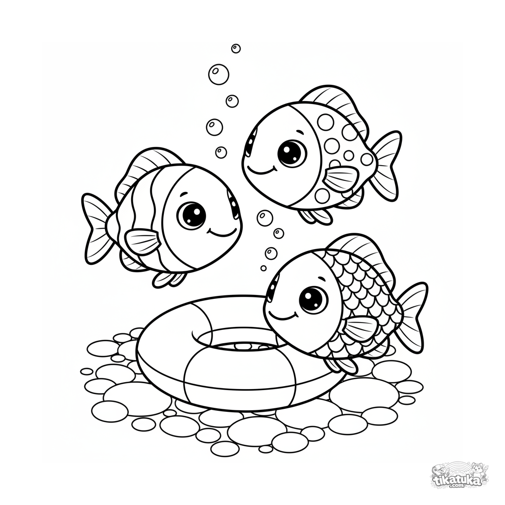 Página para colorir para crianças de 4-6 anos: um cardume alegre de peixes nada ao redor de um anel inflável no fundo da piscina. Formas claras e detalhe equilibrado.