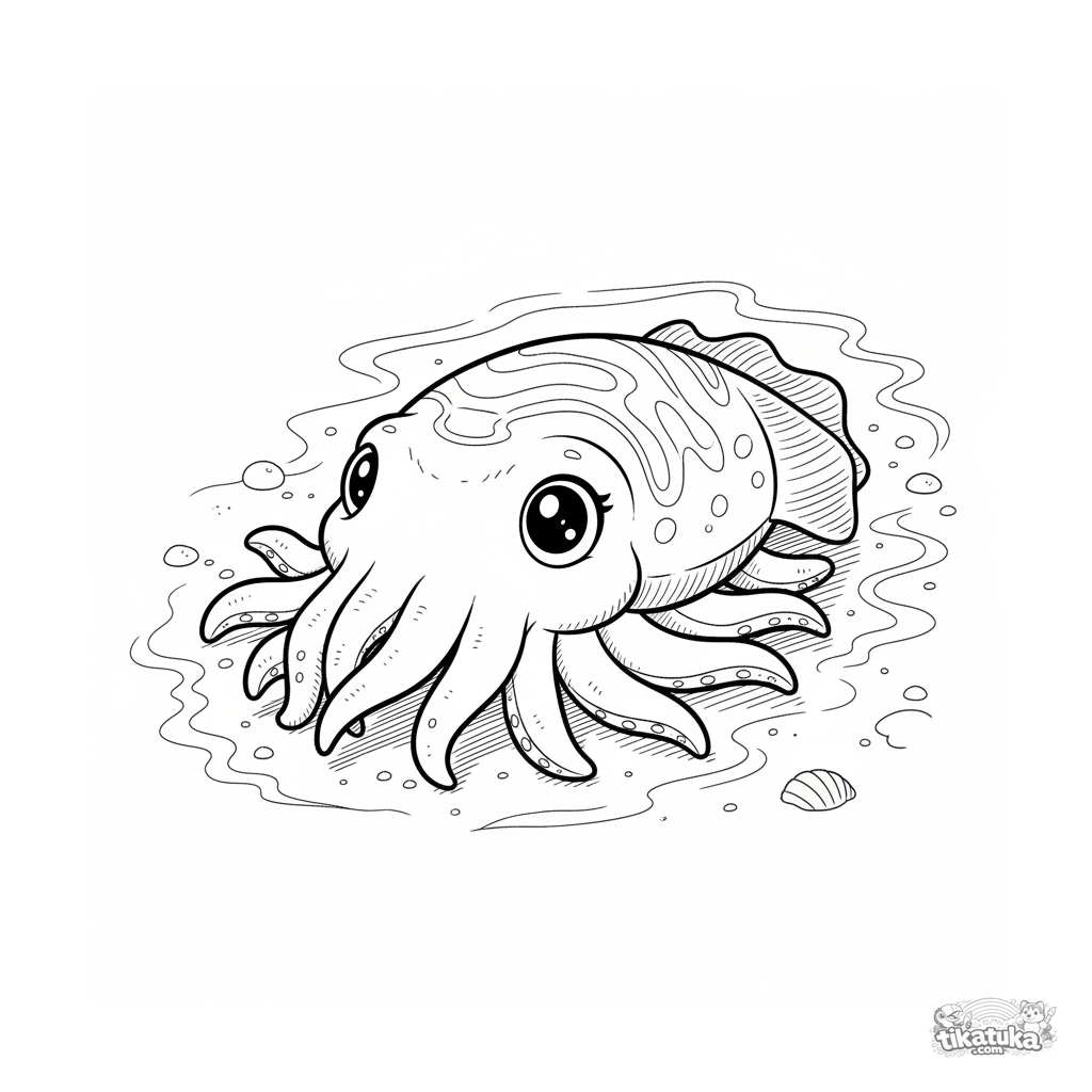 Página para colorir de um choco expressivo rastejando na areia quente em águas rasas. Para crianças de 7 a 9 anos.