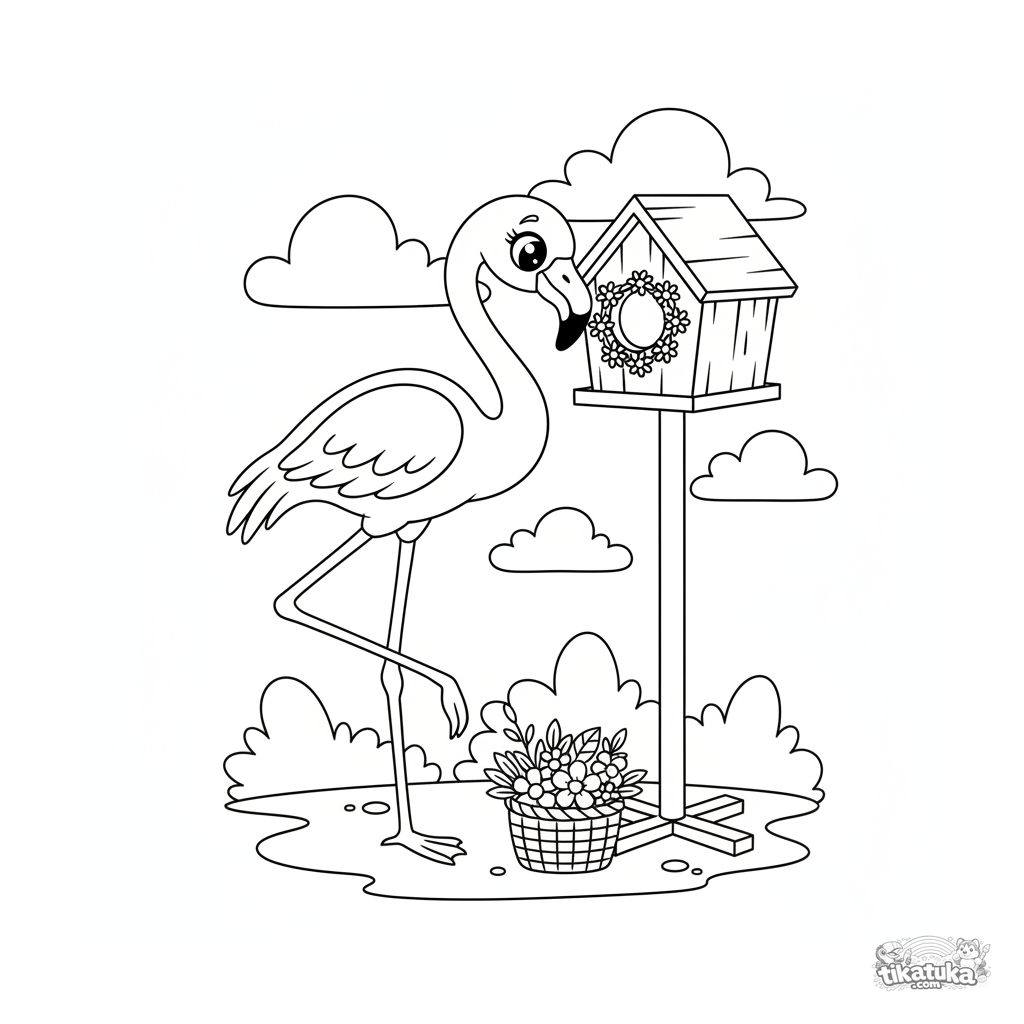 Página para colorir para crianças 7-9: um flamingo gracioso em uma perna decora a entrada de uma casa de pássaros com uma guirlanda de margaridas.