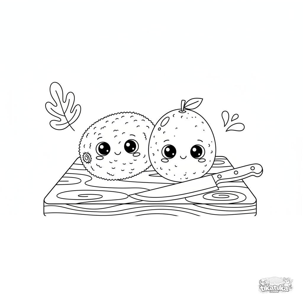Página para colorir para crianças 7-9: uma ilustração gráfica moderna de kiwi e maracujá em uma tábua. Contornos limpos, design plano.